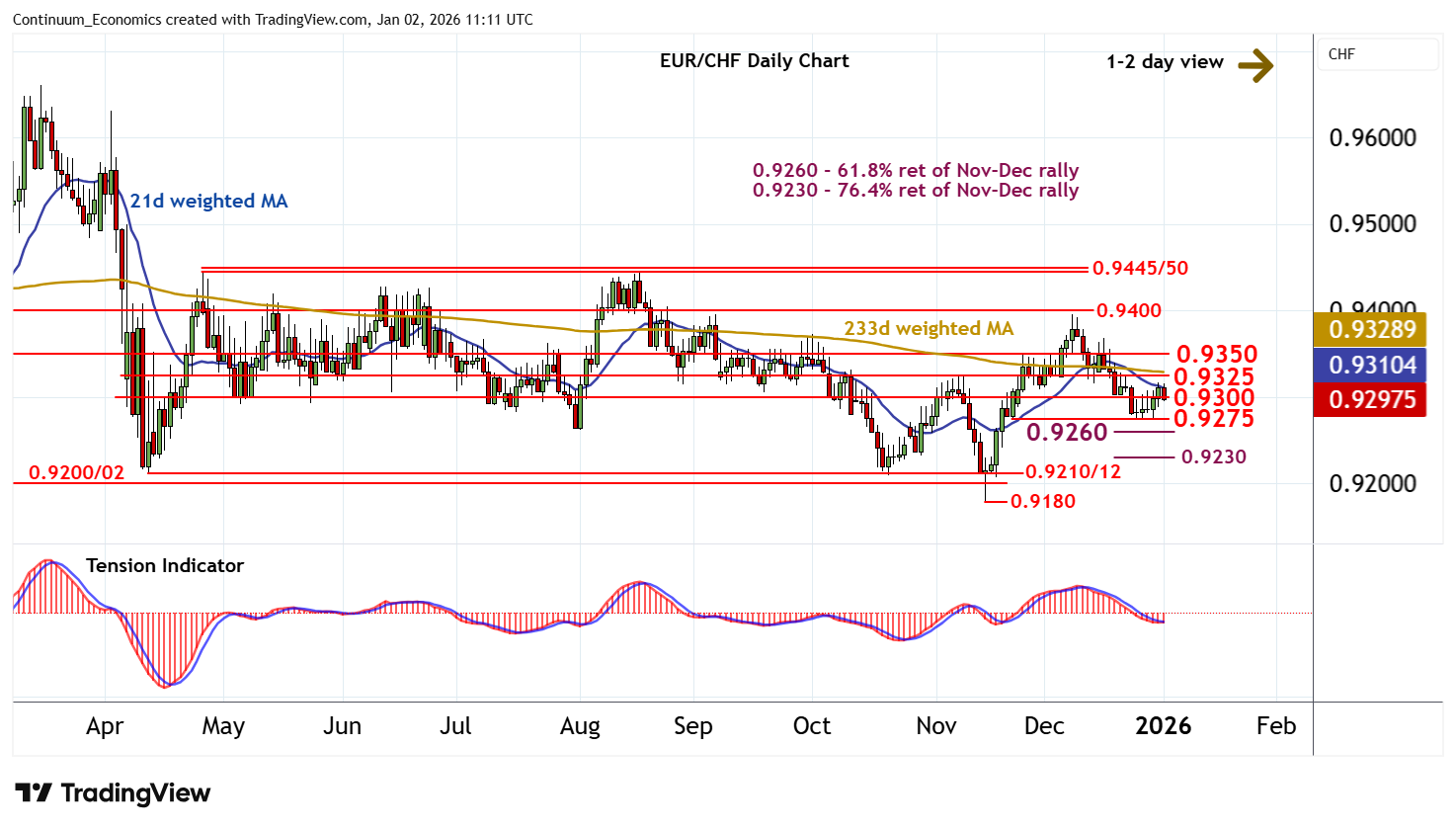 10:50 GMT - Little change, as prices extend cautious trade above congestion support at 0.9300. Intraday studies have turned down, highlighting room for a test beneath here. But rising daily stochastics and the flattening bearish daily Tension Indicator are expected to limit initial scope in renewed consolidation above the 0.9275 congestion lows. Broader weekly charts are negative, however, pointing to room for a later break beneath here and extension of December losses initially to the 0.9260 Fibonacci retracement, ahead of the 0.9230 retracement. Meanwhile, resistance remains at congestion around 0.9325. A close above here, if seen, will help to stabilise price action and prompt consolidation beneath further congestion around 0.9350.
