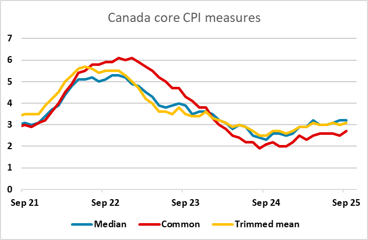 USD/CAD is down 20 pips with Canadian September CPI data coming in clearly on the strong side of consensus. All the core measures watched by the BoC came in above consensus, and this puts the BoC rate decision on October 29 in the balance. Ahead of the data, a cut was 86% priced into the curve, but 2 year yields are up 2bps on the data and a cut is now fair from certain. USD/CAD had already returned to a level consistent with the historical relationship with 2 year yields, and the risks may now be shifting towards a break back below 1.40, although this may require some further support for the possibility that the BoC leaves rates unchanged this month.