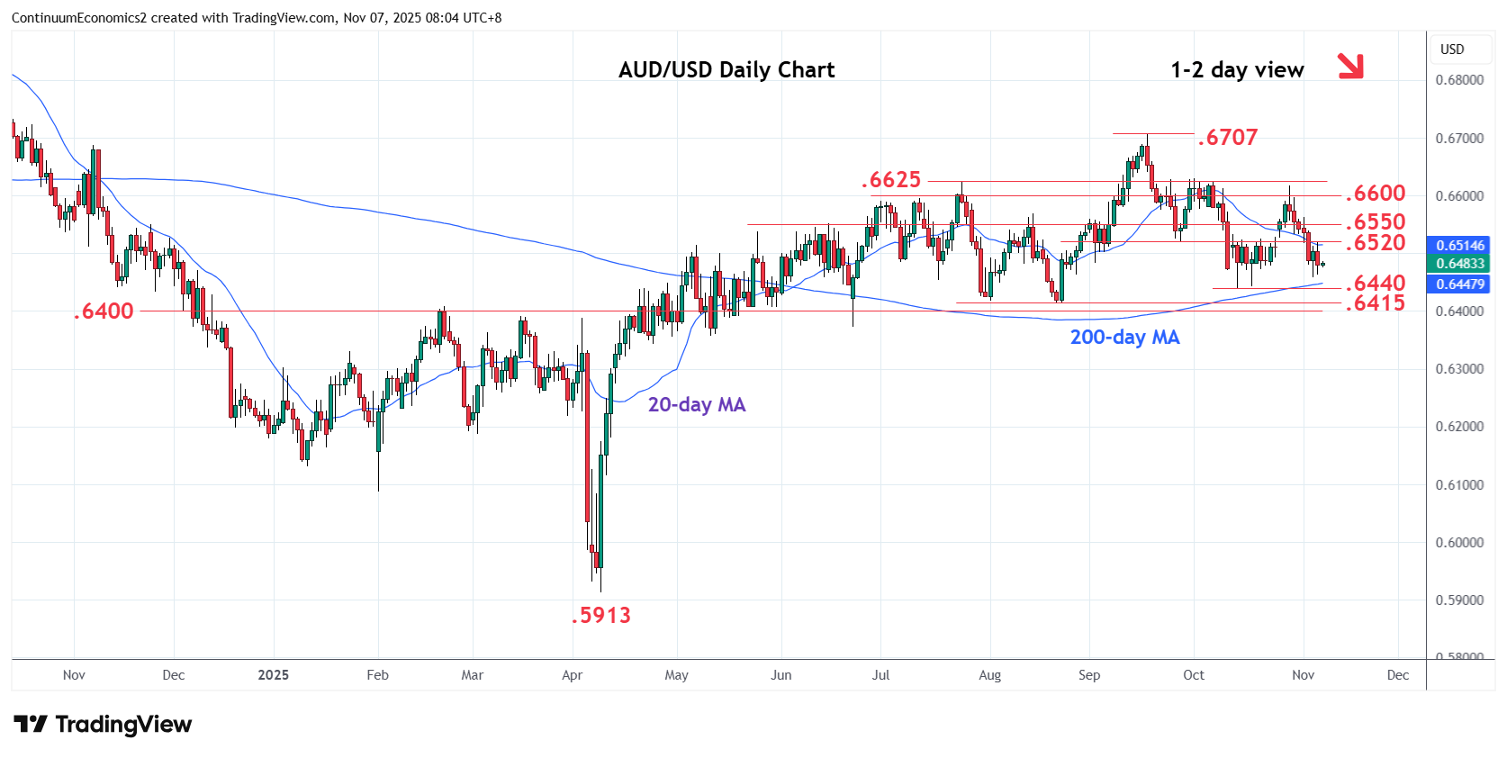 00:15 GMT - Remains in consolidation above the .6458 low with bounce attempt kept in check at the .6500/20 resistance. Higher should see resistance at .6550 congestion capping and giving way to renewed selling pressure later. Below the .6458 low will see room to retest support at .6440. Lower still, if seen, will turn focus to the critical .6415 August lows. Would need break above the .6550 resistance to fade the downside pressure and open up room for retest of the strong resistance at the .6600 level and .6625 highs