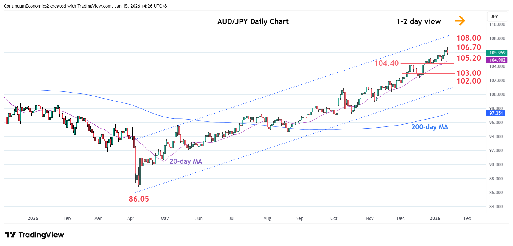 06:30 GMT - Limited on break above 106.00 level as prices gave way to selling pressure at the 106.70 high to unwind the overbought intraday and daily studies. Below the 106.00 level open up room for deeper pullback to strong support at the 105.20/104.40, December highs. Break of the latter will see deeper pullback to retrace strong gains from the 96.25 October low to the 103.00/102.700 congestion. Would take break of the 106.70 high to see room for further extend the April gains to the 108.00 congestion and 109.35, July 2024 year high.