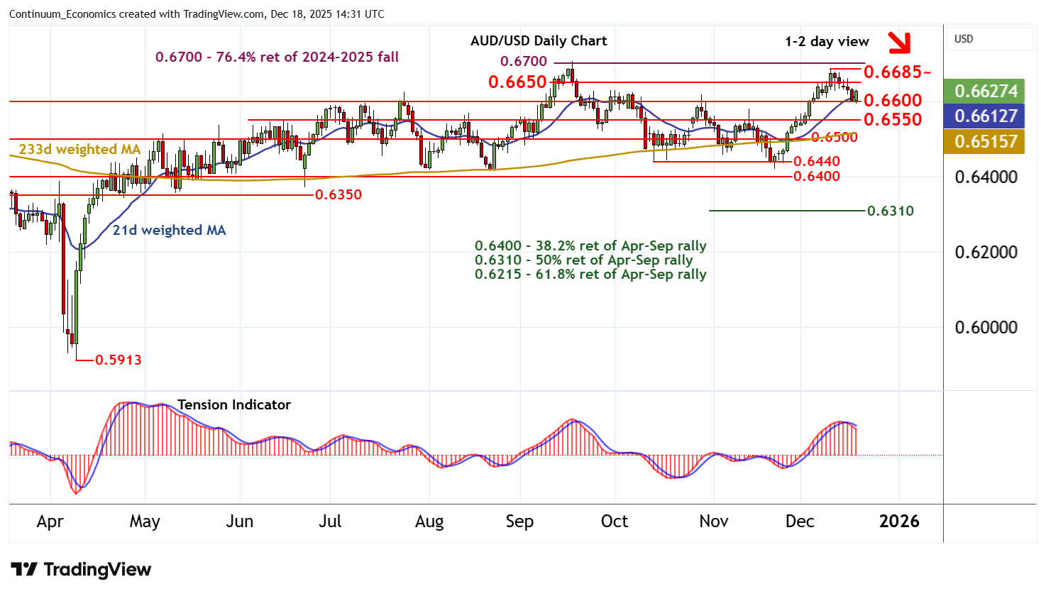 14:25 GMT - The anticipated test of congestion support at 0.6600 is giving way to consolidation, as intraday studies turn higher, with prices currently trading around 0.6625. Daily stochastics and the daily Tension Indicator continue to track lower, highlighting room for a later break. But rising weekly charts should limit any break in renewed buying interest towards further congestion around 0.6550. Following cautious/corrective trade, fresh gains are looked for. A break above critical resistance at the 0.6700 Fibonacci retracement and the 0.6705 current year high of 17 September will improve sentiment and open up a test of 0.6800.