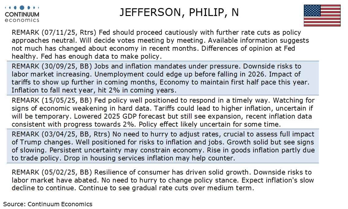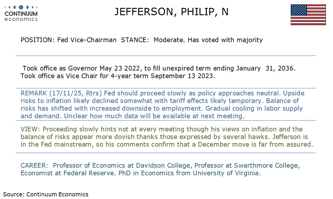 Fed's Jefferson is more dovish than several, but does not appear convinced of the case for a December easing at this point.