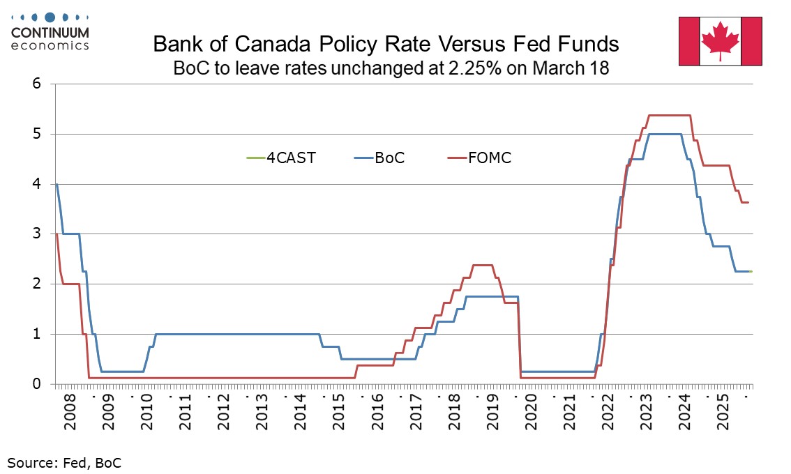 The Bank of Canada meets on March 18 and looks highly likely to leave rates unchanged at 2.25%. The statement is likely to reiterate the message given at the last meeting on January 28, that the policy rate is appropriate conditional on the economy evolving in line with expectations, but uncertainty is heightened and if the outlook changes the BoC is prepared to respond.