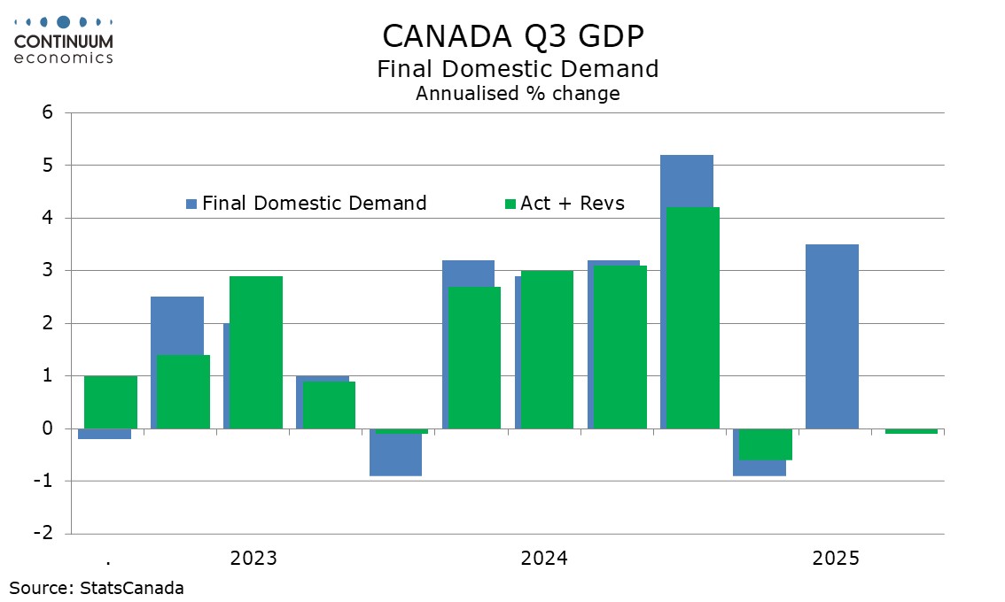 This data suggests it is very unlikely that the Bank of Canada will consider easing when it meets on December 10, having already signaled rates are likely to remain on hold unless data surprises. However, the details of the data are not strong enough for it to start considering a tightening. Historical revisions were however positive, with Q4 2024 now up 3.1% yr/yr rather than 2.3%.