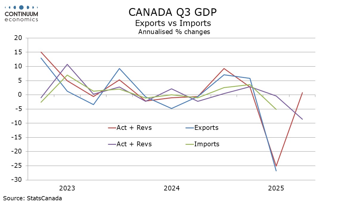 Exports rise by a modest 0.7% annualized after a 25.1% post-tariff plunge in Q2 with imports plunging by 8.6% providing most of the lift to Q3. Weakness in imports does not imply economic strength in Canada and there are some questions about the data with September trade data still absent due to the absence of inputs from the US due to the government shutdown there. Inventories were a modest negative after a strong positive in Q2.