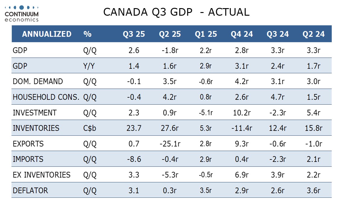 Canada’s 2.6% annualized increase in Q3 GDP id sharply higher than expected though the surprise comes largely from a sharp fall in imports. Domestic demand was almost unchanged with a 0.1% annualized decline. September GDP grew by 0.2% on the month, but the preliminary estimate for October is weak, with a 0.3% decline.