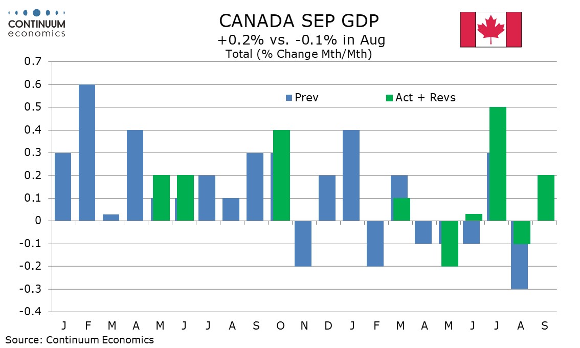 A 0.2% rise in September GDP is as the preliminary data given with August’s report signaled. August however was revised to -0.1% from -0.3% and July revised to a 0.5% increase from 0.3%, explaining why Q3 surprised so sharply while September came in as expected. September detail shows the rise led by goods at 0.6%, and that by manufacturing at 1.6%. Services saw a subdued rise of 0.1%.
