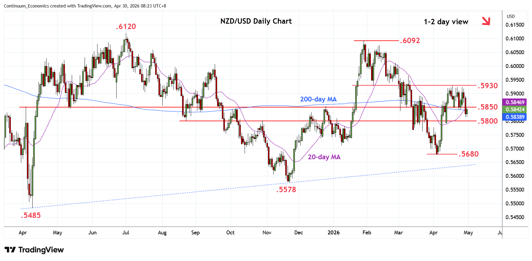 Break of the .5850/40 support see prices extending pullback from the .5930 high to reach .5815 low