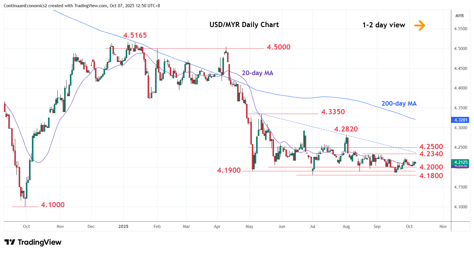 05:00 GMT - Higher in consolidation above the 4.2000 support to set up room for retest of 4.2240, 26 September high. Break here will open up room for stronger gains to retrace the August/September losses to resistance at the 4.2340 /4.2400 area. Higher still will see extension to the 4.2500/4.2600 congestion area. Meanwhile, support at the 4.2000 congestion is expected to underpin. Failure here, will expose the 4.1900/4.1800 lows to retest and threaten deeper pullback to retrace the 2024/2025 rally.