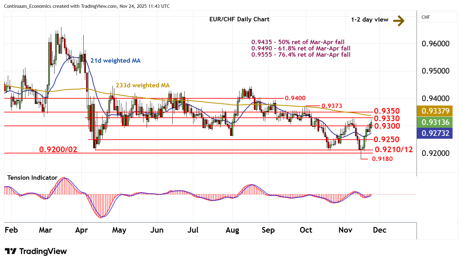 11:20 GMT - Little change, as prices extend cautious trade above congestion support at 0.9300. Daily readings are rising, highlighting room for a test of congestion resistance at 0.9330. But already overbought daily stochastics are expected to limit any immediate break in consolidation beneath further congestion around 0.8350, before rising weekly charts extend gains still further. Meanwhile, any immediate tests below 0.9300 should be limited in renewed buying interest/consolidation above 0.9250.