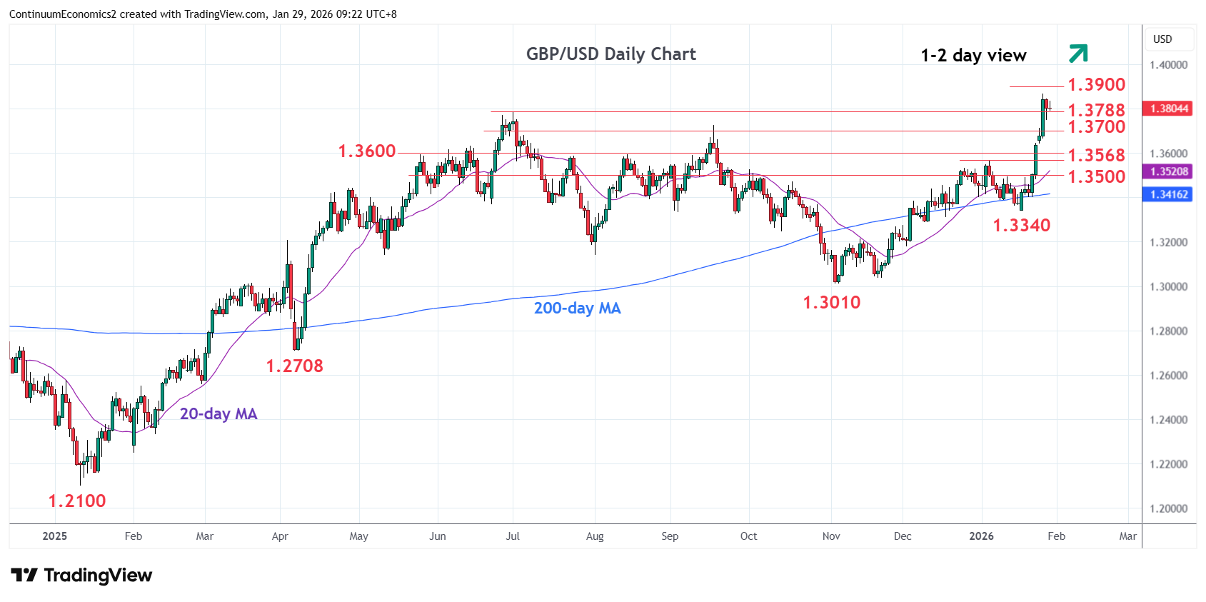 01:25 GMT - Settled back from the 1.3869 high as prices consolidate strong gains from the 1.3340 low of last week and unwind overbought intraday studies. Positive daily and weekly studies keeps pressure on the upside and consolidation is expected to give way to renewed strength to extend the broader gains from 2022 year low. Higher will see room for extension to the September 2021 high at 1.3910 then the 1.4000 figure. Meanwhile, support is raised to the 1.3788, 2025 year high, and this extend to the 1.3700 congestion which should now underpin.