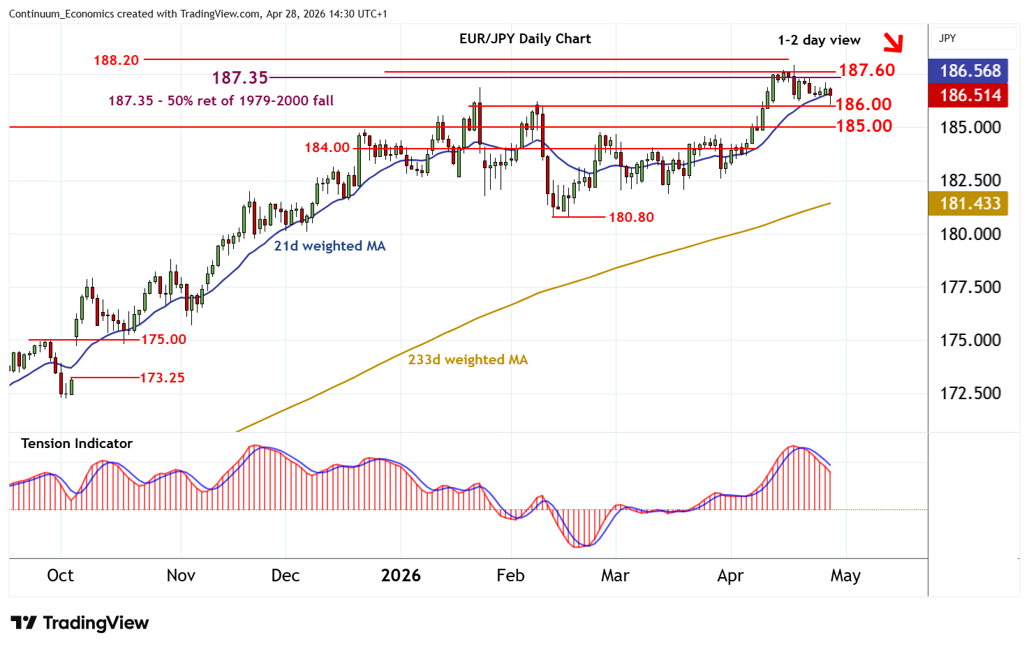 Cautious trade around 187.00 has given way to a test of support within congestion around 186.00 and the 186.25 weekly low of 20 April