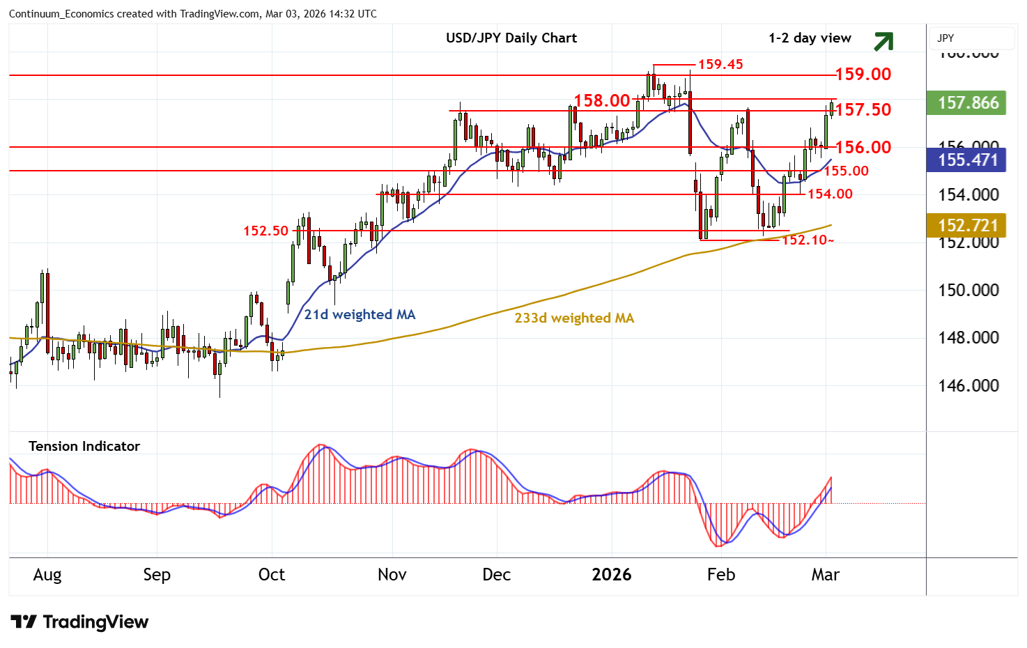 13:50 GMT - Anticipated gains have reached resistance at 158.00 in both USD- and JPY-driven trade, with prices currently balanced just beneath here. Daily readings are rising and weekly stochastics are improving, suggesting room for a break above here towards congestion around 159.00. However, flat overbought daily stochastics and a bearish weekly Tension Indicator should limit any immediate tests in profit-taking/consolidation. Meanwhile, support is raised to congestion around 157.50. A close beneath here would turn sentiment neutral and prompt consolidation above further congestion around 156.00.