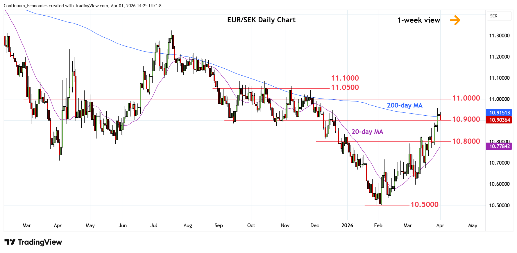 Chart EUR/SEK Update: Settling back from test of 11.0000 Fibonacci level