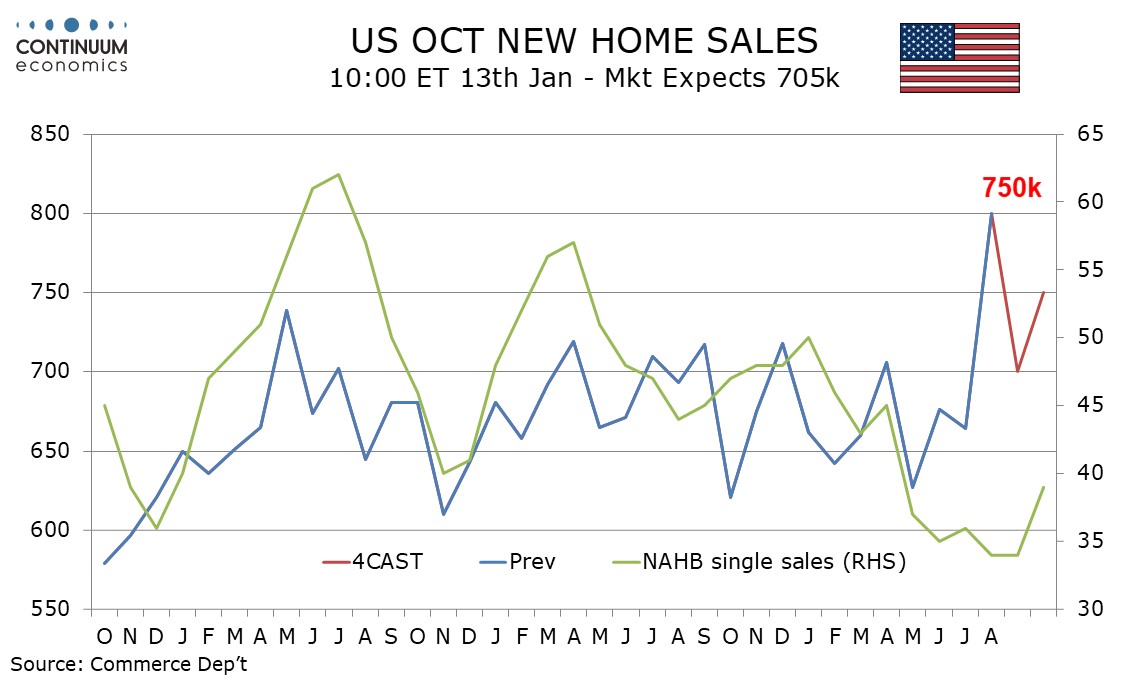 Delayed September and October new home sales data will be released on January 13. August data was surprisingly strong, up 20.5% to 800k, and despite signs of improvement in the housing sector since then, we expect September to be softer at 700k, before a bounce to 750k in October.