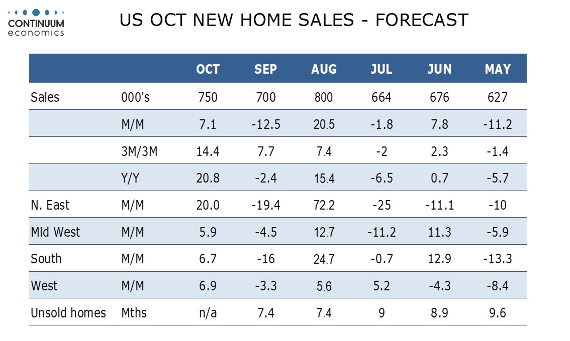 If August is unrevised September would then be down by 12.5% but risk for August’s revision is negative. We expect a 7.1% increase in October. August’s strength contrasted slippage in existing home sales but existing home sales have since seen three straight gains, while pending home sales and other housing sector surveys have also picked up as the Fed resumed easing. Before August’s bounce new home sales had been in a stable range between 600k and 750k. We expect a return to the range in September but October data to suggest that trend is now picking up.