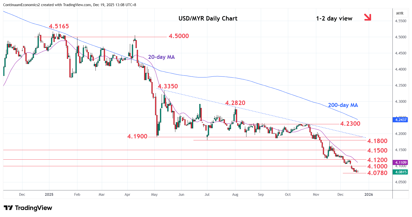 05:20 GMT - Still slipping as prices extend sharp losses from the 4.2300 October high to reach fresh year low at 4.0810. Nearby see room to the 4.0780, 76.4% Fibonacci level, and the 4.0650/4.0500 congestion. Deep oversold daily and weekly studies see bearish momentum starting to slow and caution corrective bounce. Meanwhile, resistance is at the 4.1060 and 4.1240 recent lows. Would need lift over these to ease the downside pressure and open up room for corrective bounce to retrace losses from the 4.2300, October high.