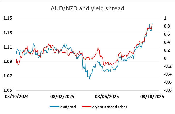 The RBNZ meeting looks like the main event for Wednesday. All forecasters expected a rate cut, but were split on the likely size, with 15 of 26 in the Reuters survey going for a 25bp cut and 11 looking for 50bps. Market pricing suggests it was close to a 50-50 call between 50 and 25. The actual 50 bp was therefore NZD negative. There was no official revision to the OCR forecast from August. But unlike the August cut, the 50bps cut in October is a consensus cut, which means all members agree that short term CPI may be volatile but the long time economic condition needs more accommodation. In the forward guidance, the RBNZ is consistent with their August forecast which points towards at least one more cut in the November meeting. AUD/NZD continues to follow the 2 year yield spread higher, but may pause below 1.15.