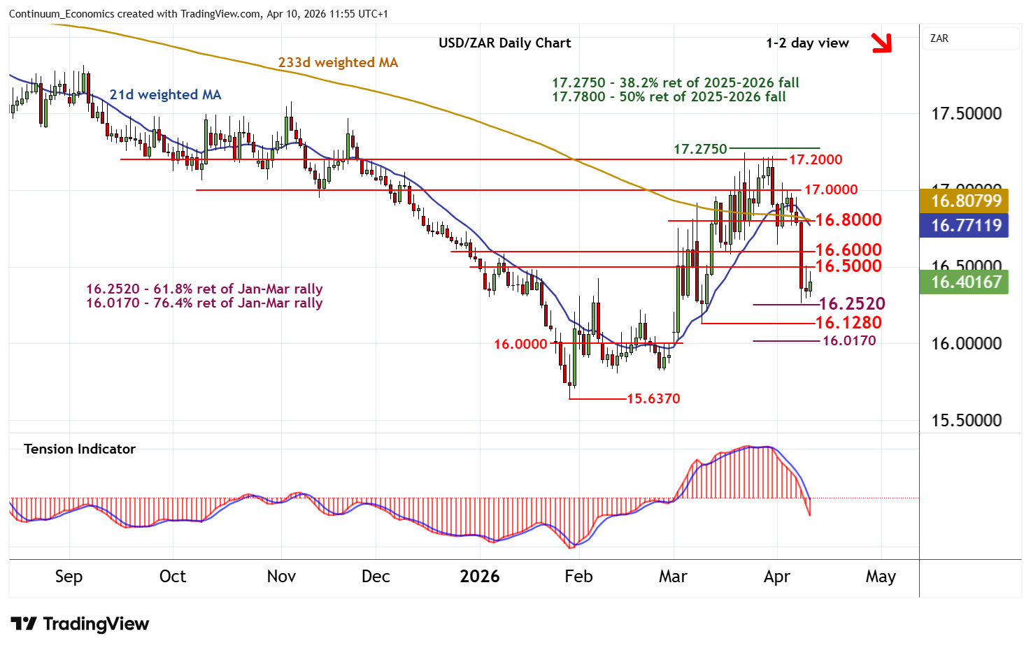 11:45 BST - Little change, as prices extend cautious/choppy trade beneath resistance at the 16.5000 break level. Intraday studies continue to rise, highlighting potential for a test above here. But negative daily readings and unwinding overbought weekly stochastics should limit scope in renewed selling interest towards 16.6000. Following corrective trade, fresh losses are looked for. Support is at the 16.2520 Fibonacci retracement. A later break beneath here will add weight to sentiment and extend late-March losses towards the 16.1280 weekly low of 10 March. However, the rising weekly Tension Indicator and improving longer-term charts should limit any deeper losses in short-covering/consolidation above strong support within the 16.0000 - 16.0170 range.