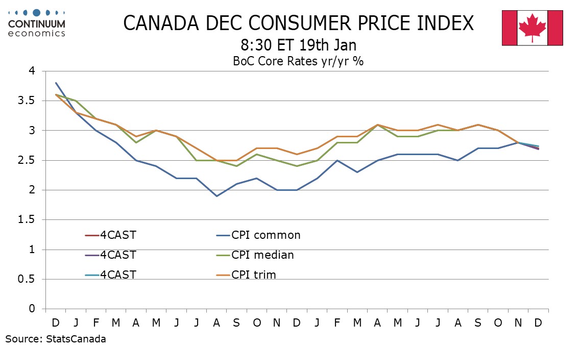 The ex food and energy rate is not one of the BoC’s three core rates and these are likely to be less influenced by tax changes, allowing the slowing underlying pace to be reflected. We expect yr/yr rates of 2.7% from all three, CPI-Common, CPI-Median and CPI-Trim, down from 2.8% in November. Before rounding CPI-Median, at 2.69% from 2.78%, is likely to be a little softer than CPI-Trim, which we expect to slow to 2.74% from 2.84%.