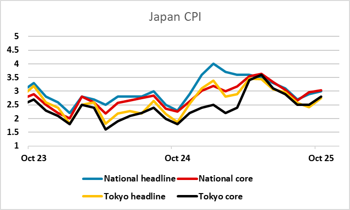 Friday kicks off with Tokyo November CPI data – effectively preliminary CPI for Japan – which has more significance than usual given the speculation about a possible BoJ rate hike in December. Market consensus is for a small drop in the y/y rate to 2.7%. This would be unlikely to prevent calls for a December rate hike intensifying. The JPY has remains soft on the crosses this week as equities have recovered, despite increased expectations of BoJ tightening, but continues to looks dramatically undervalued across the board.