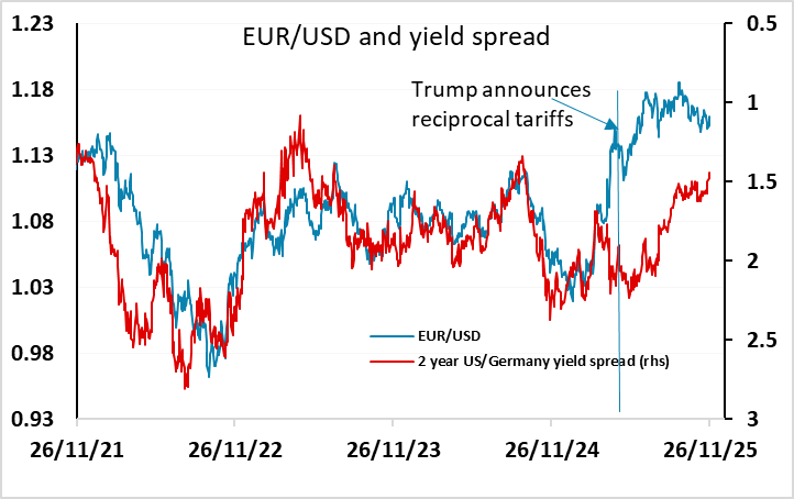 Friday also sees preliminary CPI data from France, Spain and Germany, but the ECB remains firmly in no change mode so it would take a lot for this data to have any significant impact. We also have revisions to Q3 GDP data for Sweden, France Italy and Switzerland, but revisions are typically minor so shouldn’t have a substantial impact. The EUR has remained from through the week, but strength looks to be related more to being the USD’s antipole than any intrinsic attraction. The EUR has significantly outperformed yield spreads since April’s announcements of US reciprocal tariffs, in contrast to the underperformance of spreads from the JPY and AUD. The risk is that the market falls out of love with the EUR with better value available elsewhere. A 1.14-1.18 range is looking hard to break medium term.