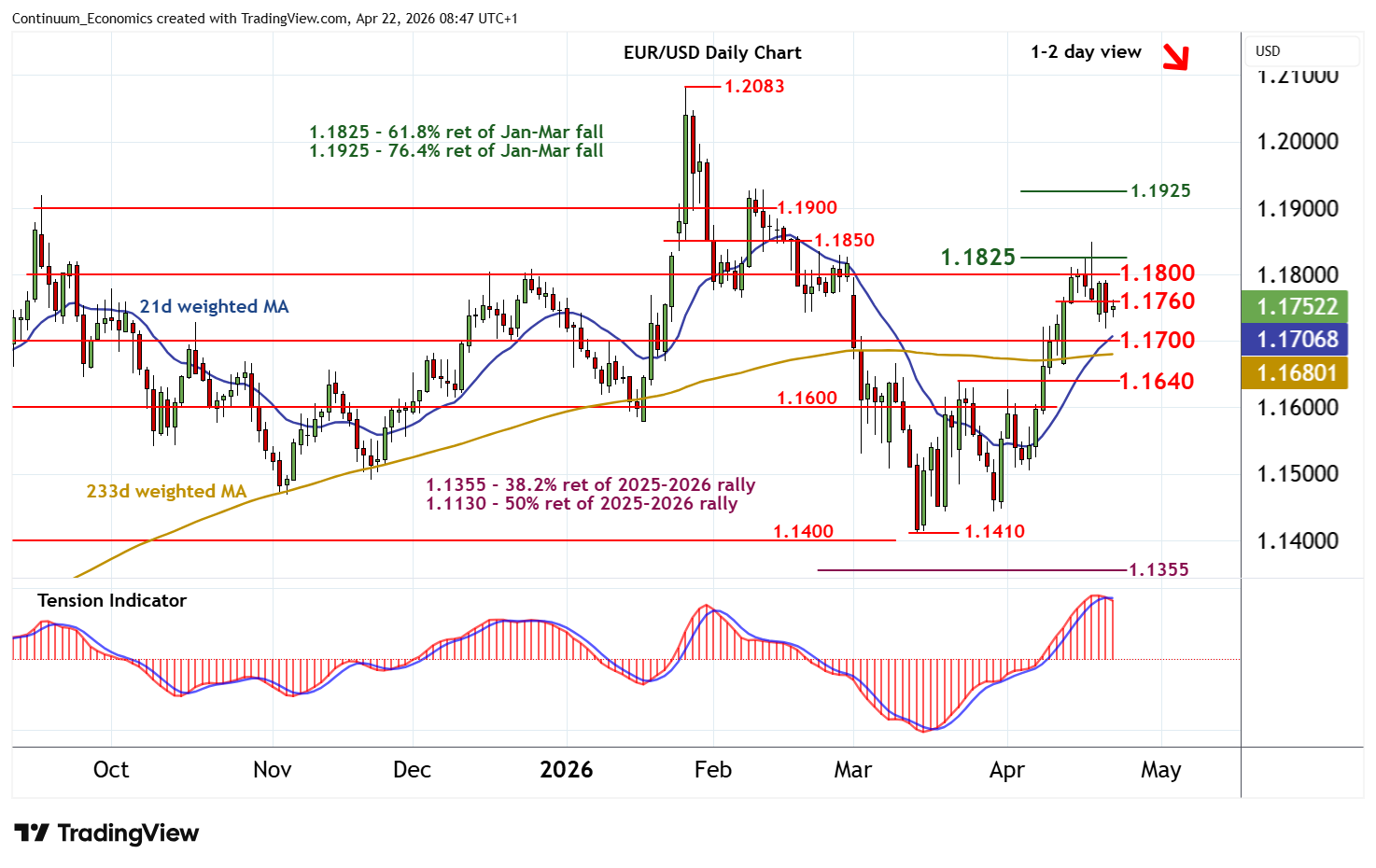 08:30 BST - Anticipated selling interest has reached 1.1720~. Flat intraday studies are prompting a bounce to resistance at 1.1760, but negative daily stochastics and a tick lower in the daily Tension Indicator should limit any break in renewed selling interest beneath congestion around 1.1800. Following cautious trade, fresh losses are looked for. A break below 1.1720~ will open up congestion around 1.1700. However, rising weekly charts should limit any deeper losses in buying interest/consolidation towards the 1.1640 weekly high of 23 March.