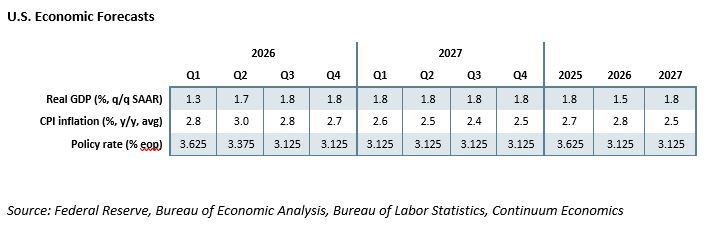 After a subdued start to 2026, we expect GDP to return to potential at 1.8% in the second half of 2026 and through 2027, with annual GDP growth at 1.5% in 2026 and 1.8% in 2027. Consumer spending, which at 2.5% in 2025 is likely to significantly outperform GDP growth of 1.8%, looks set to slow to a pace of 1.5% in both 2026 and 2027. We expect core PCE prices to see annualized growth accelerate to 3.2% in Q1 2026, before slowing to 2.7% in Q2. The subsequent six quarters we expect to be close to, but marginally above the Fed’s 2.0% target, with core PCE prices averaging 2.7% in 2026 and 2.2% in 2027. For overall PCE prices we expect a 2.6% rise in 2026 and 2027 also at 2.2%. CPI is likely to be slightly firmer than PCE prices, at 2.8% in 2026 and 2.5% in 2027.