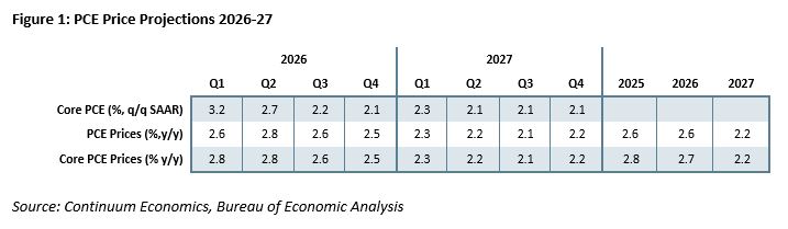 With employment growth likely to remain moderate at best, for consumers to regain momentum needs inflation to fall to lift real disposable income growth. To date inflation has seen less of a boost than expected from the tariffs, but tariffs are being passed on only slowly. Recent years have tended to see above trend quarters from inflation in Q1 as new year pricing decisions are made, and this is likely to be the case in early 2026. Clear signs of a slowing in inflation may not appear until the second half of 2026, and even in 2027 we expect that progress will stall marginally above the Fed’s 2.0% target (Figure 1).