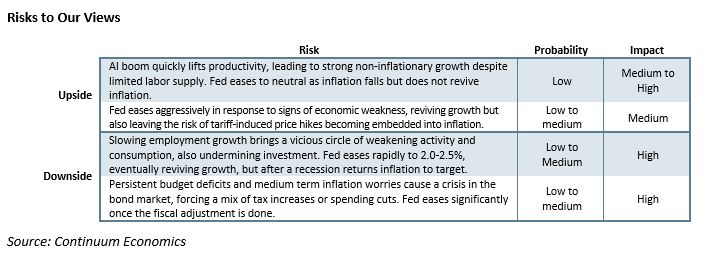 Risks do lean to the downside on employment, but to the upside on inflation, particularly if the economy proves resilient and the Supreme Court approves the reciprocal tariffs. Our expectation is that inflation will stabilize marginally above the Fed’s 2.0% target, and then easing to 3.0-3.25% would still be credible. Stabilization at 2.5% would be more problematic, but might be tolerated by a Hassett-led Fed. Should inflation remain near 3.0% though 2027 however, tightening would be necessary, even if probably facing resistance from Trump.