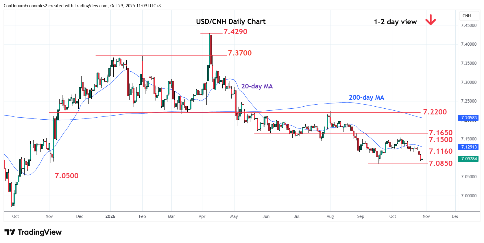 Chart USD/CNH Update: Under pressure, 7.0850 low at risk