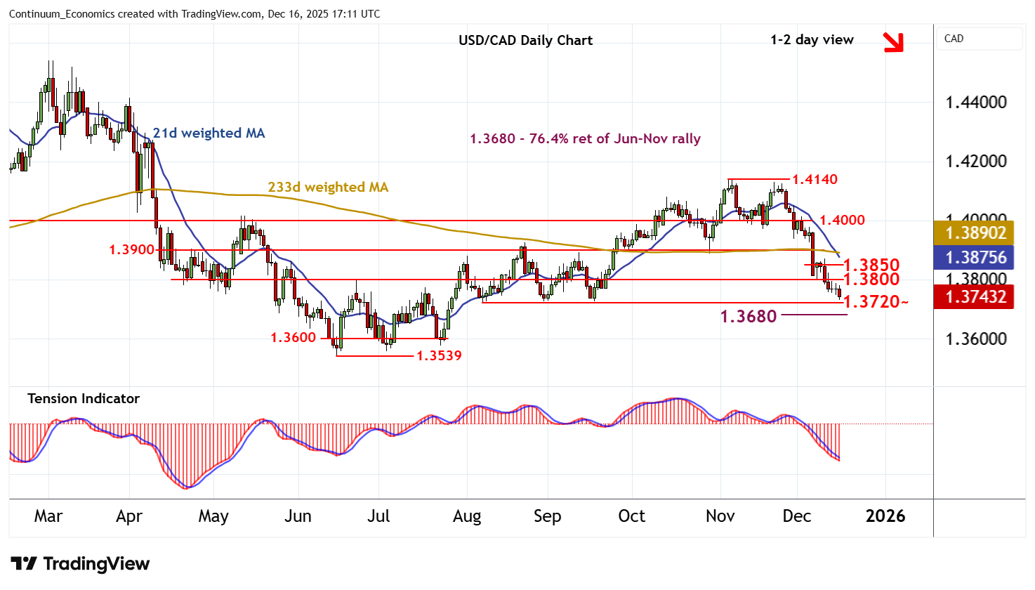 16:35 GMT - Cautious trade has given way to fresh selling interest, as intraday studies turn down, with prices currently consolidating above the 1.3720~ lows from August-September. Daily readings are mixed/negative and broader weekly charts are bearish, highlighting room for further losses in the coming sessions. A close beneath here will add weight to already bearish price, action and extend November losses towards the 1.3680 Fibonacci retracement. Flat oversold daily stochastics could limit any initial tests in consolidation/short-covering. Meanwhile, resistance remains at congestion around 1.3800. A close above here, if seen, would help to stabilise price action and give way to consolidation beneath further congestion around 1.3850.