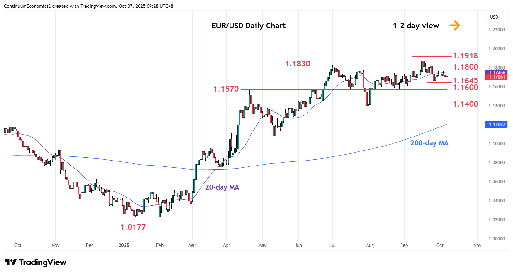 01:35 GMT - Little change, after prices failed to sustain break below the 1.1700 level. However, ranging action see scope to further probe the 1.1645 support. Would take break here to further extend losses from the 1.1918, 17 September current year high. Lower will see deeper pullback to retrace the August/September rally to the 1.1600/1.1570 support. Meanwhile, resistance at the 1.1800/30 area is expected to cap. Break needed to return focus to upside for retest 1.1900/18 congestion and September high.