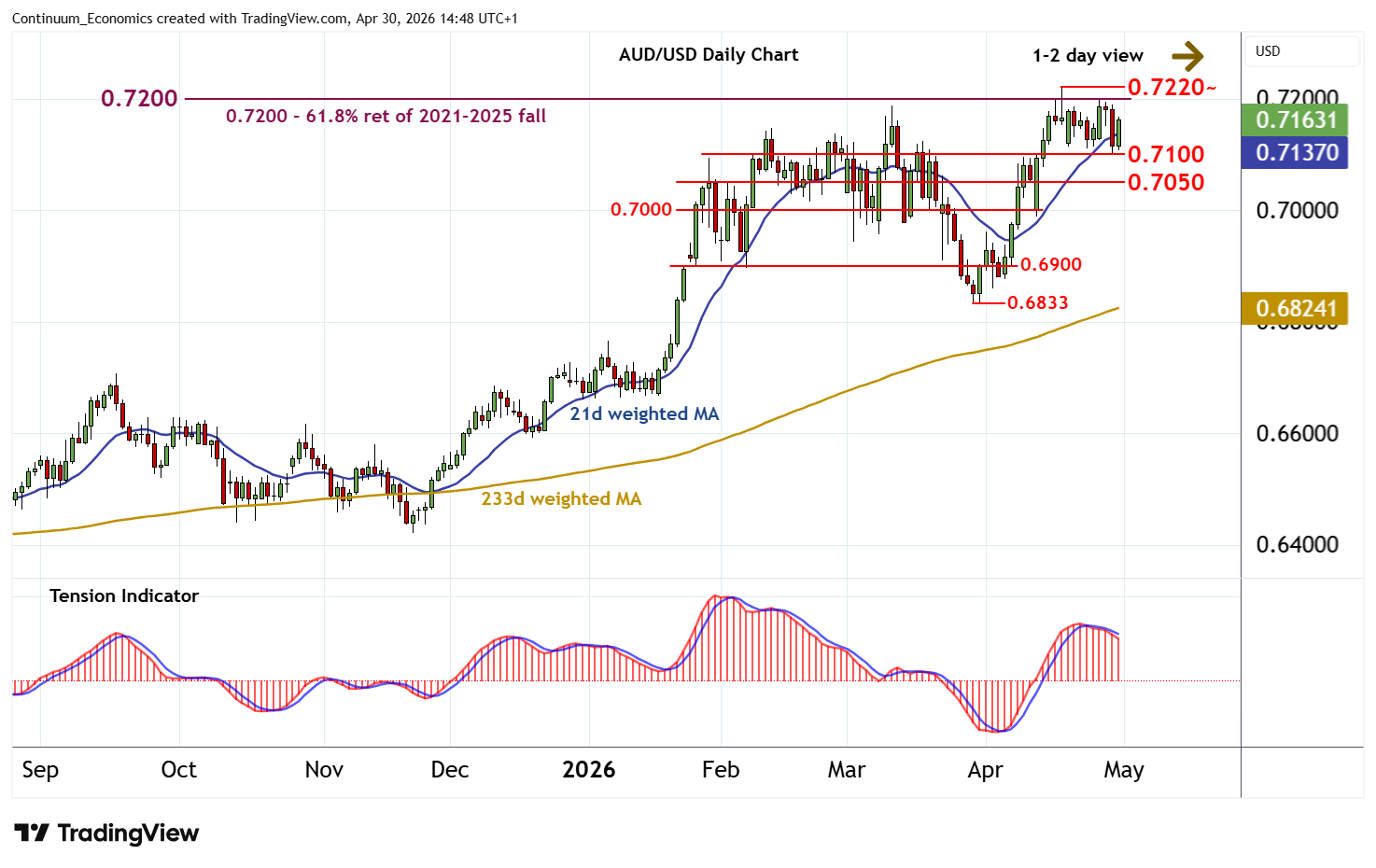 | R1 | 0.7200 | ** | 61.8% ret of 2021-2025 fall | S4 | 0.6960 | * | 1 Apr (w) high |