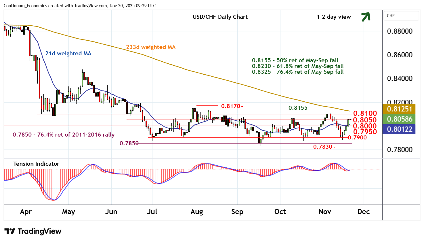 09:20 GMT - Anticipated gains have reached resistance at 0.8050, where unwinding overbought intraday studies are prompting short-term reactions. Daily readings continue to rise, however, highlighting room for still further gains in the coming sessions. Focus is expected to turn to 0.8100. But mixed weekly charts should limit any initial tests in consolidation. Meanwhile, support remains down to congestion around 0.8000 and should underpin any immediate setbacks.