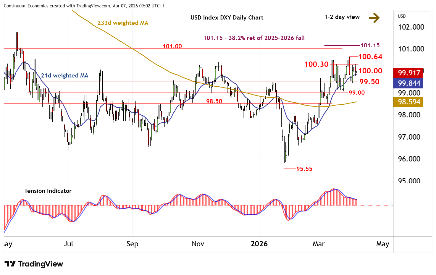 09:10 BST - Cautious trade, as prices consolidate the break above 100.00. Intraday studies are rising, suggesting room for a retest of congestion highs around 100.30. But mixed/negative daily readings should limit any initial tests in fresh consolidation, before improving longer-term charts prompt a break and open up a test of strong resistance at the 100.64 current year high of 31 March. Meanwhile, any immediate tests below congestion support at 100.00 should meet renewed buying interest towards further congestion around 99.50.