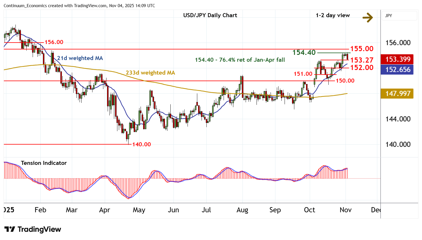 09:00 GMT - Still little change, as prices extend consolidation within resistance at 100.00/26. Intraday studies are leaning lower and overbought daily stochastics are flattening, suggesting potential for a minor pullback. But the positive daily Tension Indicator and rising weekly charts should limit scope in renewed buying interest above support at the 99.56 weekly high of 9 October. Following cautious trade, fresh gains are looked for. However, a close above the 100.26 monthly high of 1 August is needed to improve sentiment and extend mid-September gains initially to the 100.54 weekly high of 29 May and the 100.65 Fibonacci retracement.