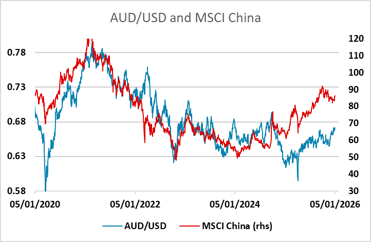 First up on Wednesday we have Australian CPI data for November, but right now the AUD should be quite resilient in the face of domestic news, as there is already strong support for the AUD based on current yield spreads. But whether the AUD can continue to advance to new highs looks likely to depend on global equity market performance more than domestic data, with recent AUD/USD moves tending to correlate with moves in global equities. We like the AUD as the best of the riskier currencies, but against the safer havens it is likely to require positive risk appetite to extend recent gains.