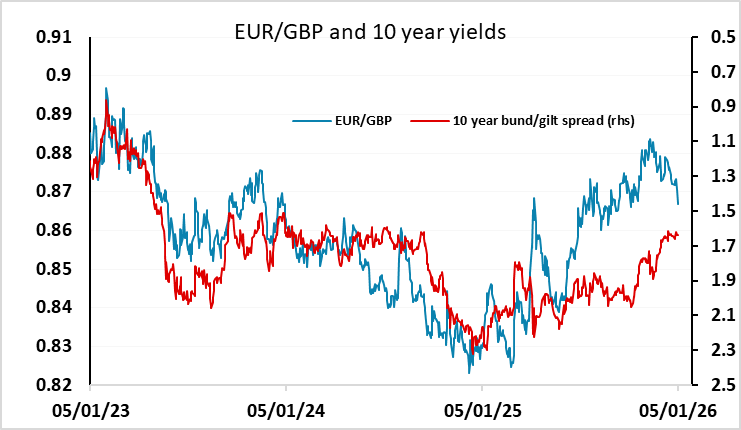 We would therefore be a little wary of the risk positive FX moves we have seen at the beginning of the year, particularly the strength in GBP, as the UK economic data doesn’t justify much confidence, and GBP is already at quite high levels against a range of currencies, notably the JPY. While a comparatively hawkish Bank of England justifies some GBP resilience, we doubt this will last long into the year if the UK data continues to show weak/no growth and declining wage and price pressures. GBP hit its highest level since September against both the USD and EUR on Tuesday, and GBP/JPY hit is highest since 2008! It’s hard to see value in the pound here, and there should be vulnerability if there is any weakening in risk sentiment.