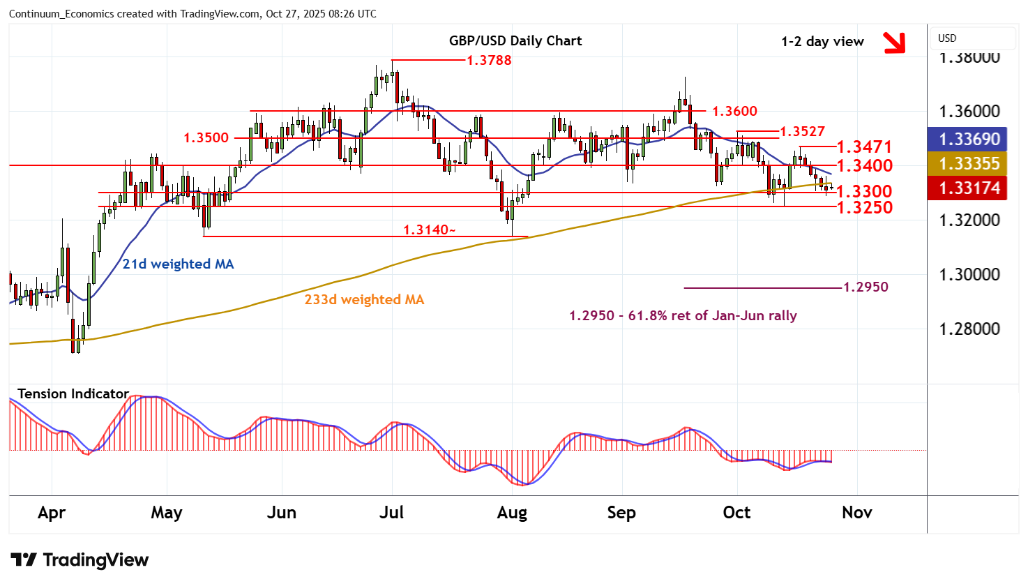 Little change, as mixed intraday studies keep near-term sentiment cautious and extend consolidation following the test of congestion support at 1.3300