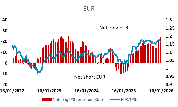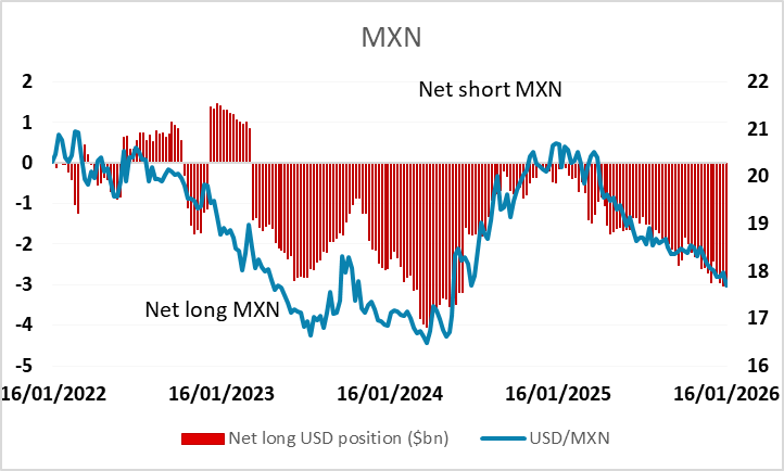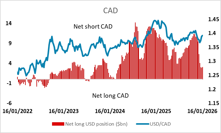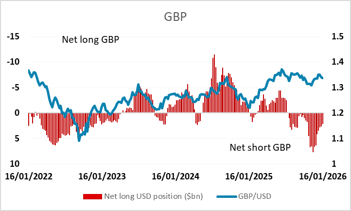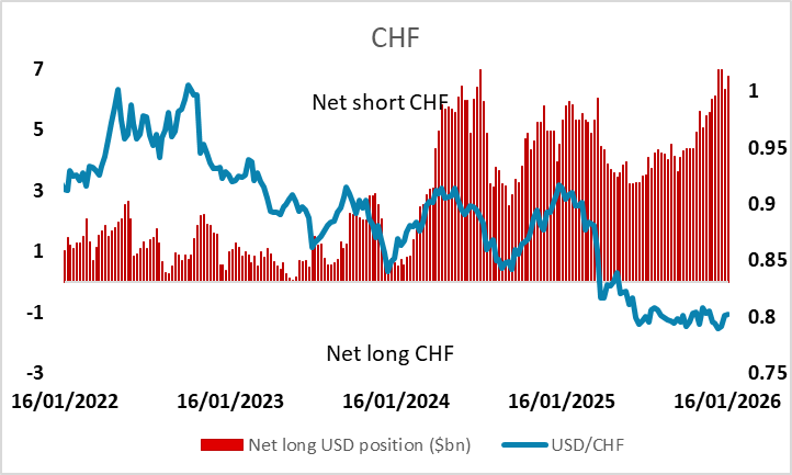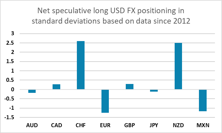 Net speculative positioning remains very short CHF and NZD, long EUR. JPY positioning turns short, largest since November 2024