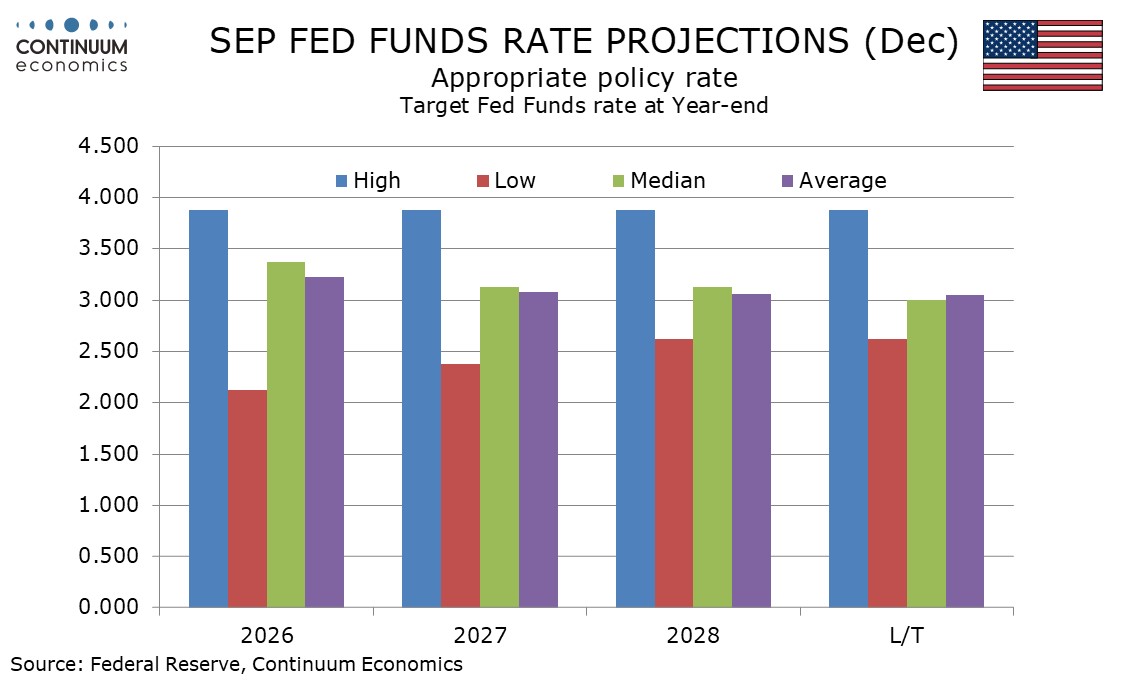 Two would have to shift in a dovish direction to push the median dot into projecting two easings in 2026, so that is not out of the question, but there is no strong reason to expect that there will be any shift in either direction, so we expect the dots to look similar to December’s. The 2027 and 2028 dots are fairly evenly spread with six in each year being on the median of 3.0-3.25%, which would imply one further easing in 2027 after one in 2026, and steady policy in 2028. We do not expect any change in the medians for either 2027 or 2028. The long-term median is likely to remain at 3.0% though there is some debate on this, with some feeling that an AI-led boost in productivity will lower inflation and hence lower the neutral rate, and some feeling that strong investment demand will increase it. This debate is unlikely to be resolved any time soon, though Chair nominee Kevin Warsh will be an advocate of the former view.