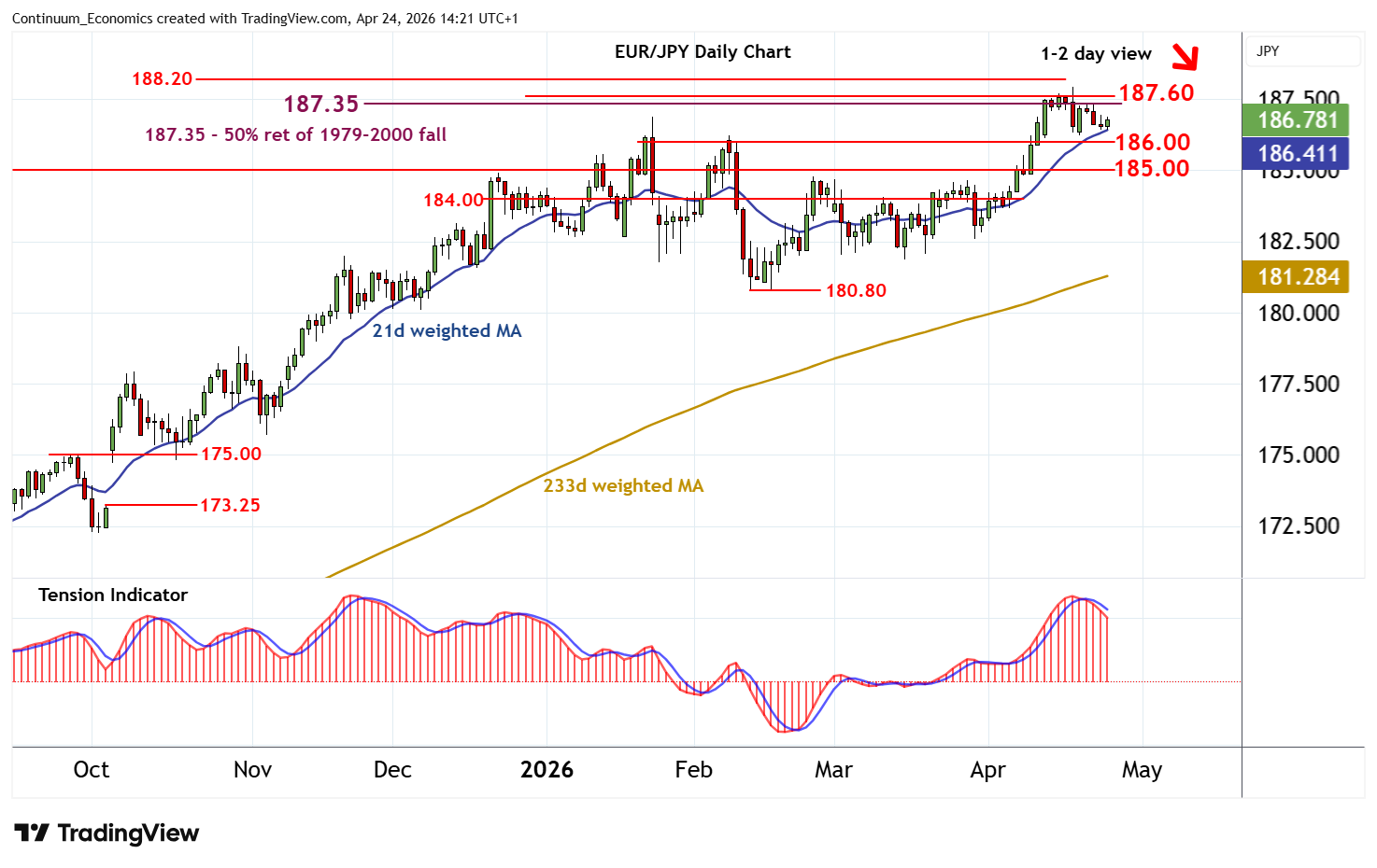 | R3 | 187.95/00 | * | 17 Apr YTD high; figure | S2 | 186.00 | * | congestion | |