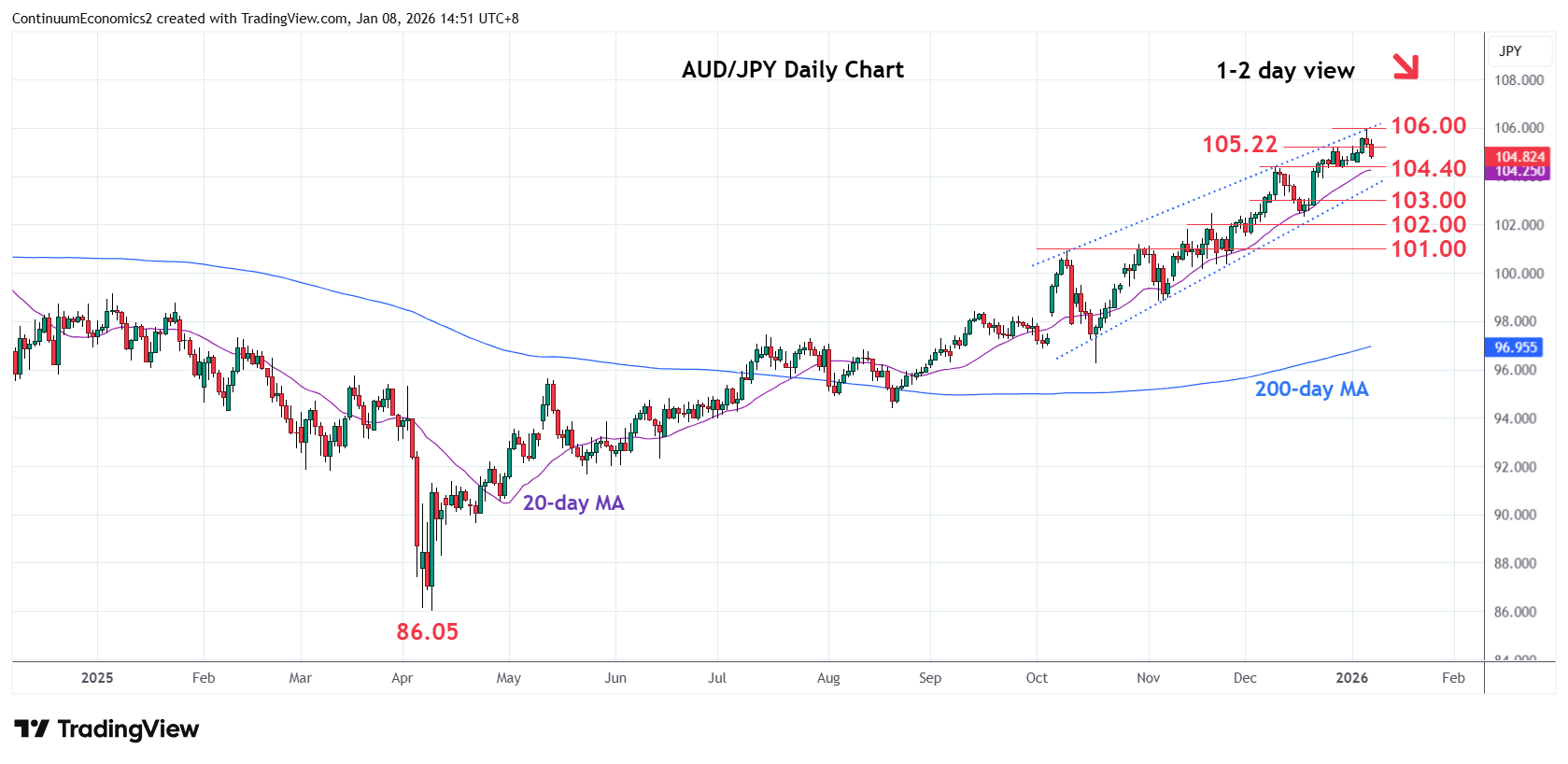 06:50 GMT - Extending rejection from fresh high at 105.95 as prices unwind overbought daily studies. Pullback below the 2025 year high at 105.22 and the 105.00 level opens up room for deeper pullback to retrace gains from the October low. Lower see room to strong support at the 104.40/104.00 area. Failure to hold this will fade the upside pressure and see room for deeper correction to 103.00 congestion and 102.50/00 area. Meanwhile, resistance at the 105.22/105.95 highs are expected to cap. Break here, if seen, will open up room for extension to the 107.00/108.00 congestion area.
