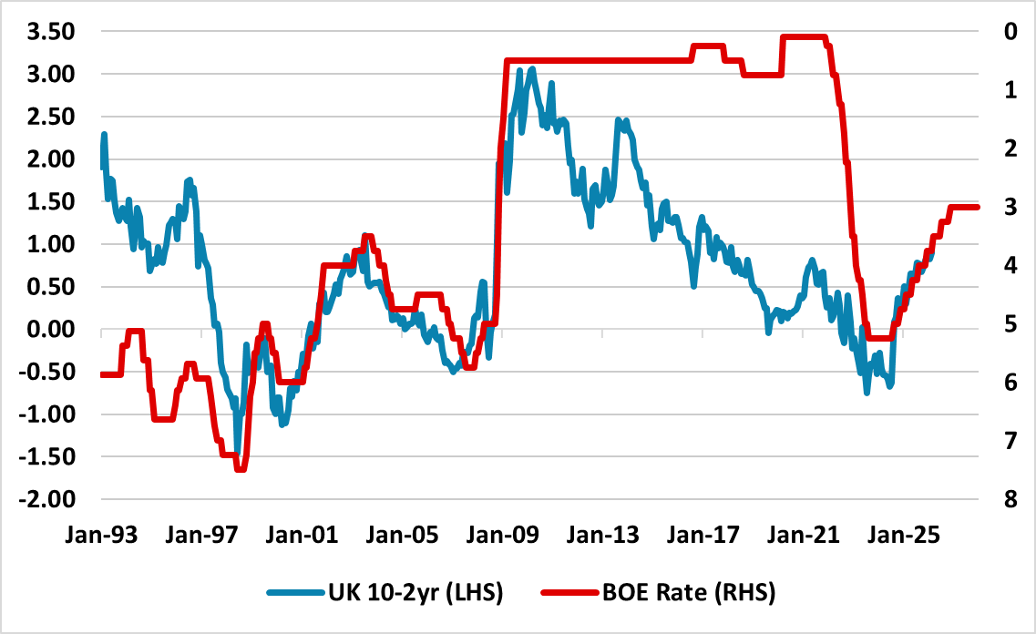 Figure 4: 10-2yr UK Gilt Curve and BOE Bank Rate Actual and Forecast (%)