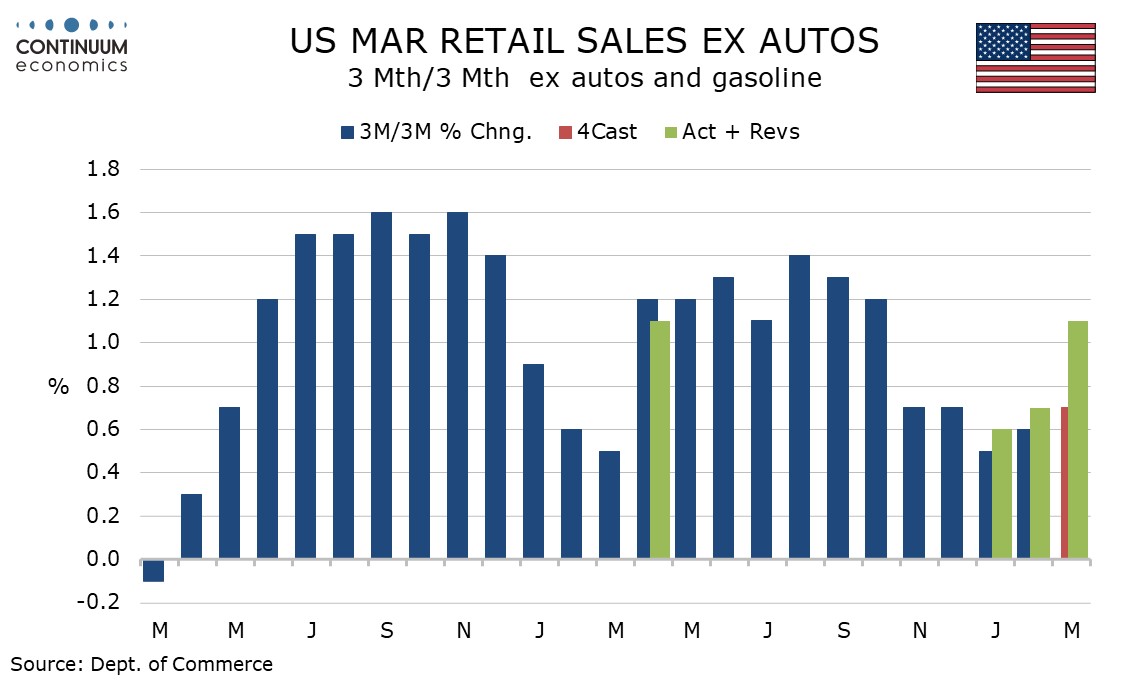 Q1 sales ex auto and gasoline rose by 1.1% (not annualized) after a 0.7% rise in Q4, thus regaining some momentum despite some bad weather in January and February, and thus showing resilience to weakness in real disposable income, something rising gasoline prices will further undermine. Quarterly gains of 1.2% in overall sales and 1.4% ex auto were stronger still, but lifted by gasoline.