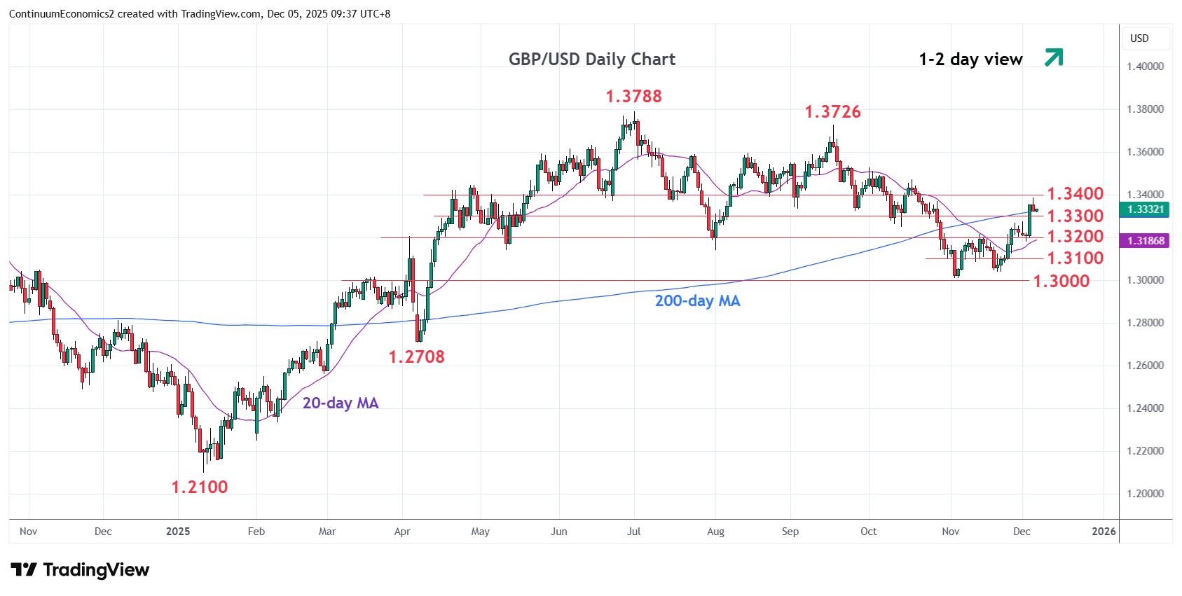 01:45 GMT - Settled back from test of resistance at the 1.3370/1.3400 area as prices unwind overbought intraday studies. Positive daily and weekly studies suggest consolidation giving way to renewed buying interest later to further retrace the September/November losses. Above the 1.3400 level will open up room for extension to the 1.3471 resistance then the strong resistance at the 1.3500/27 area. Meanwhile, support is raised to the 1.3300/1.3275 area which should now underpin and sustains gains from the 1.3038/10, November lows.