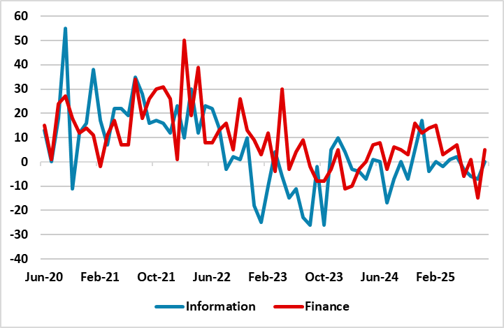 · AI, Productivity/Cost cutting and Growth. AI also has the potential to modestly or moderately raise productivity growth, which in turn boosts overall growth and suppresses inflation like the ICT revolution. This can produce a secondary boost to tech revenue and profits, as well as the wider U.S. equity market. However, it is not yet clear in the U.S. productivity numbers, whether existing AI adoption is clearly boosting productivity despite anecdotal stories – AI adoption and rollout is more of a U.S. centric story, though China and Asia are also benefitting. An alternative viewpoint is to monitor job losses caused by AI, which has been a rising feature of U.S. corporate earnings reports. However, it is unclear whether AI is being exaggerated as an excuse to cut jobs following the excessive hiring in the U.S. during the 2021-23 period. Job numbers in white collar finance and IT need to be watched closely in U.S. employment reports and other data through 2026-27 to understand the developing trend (Figure 3), but for now, are not a cause for alarm. Clear job losses, but in line with the ICT revolution, would help AI optimism without side effects. Large scale job losses would help AI optimism, but not the macro or U.S. equities ex tech stories, as it would raise long-term concerns about U.S. employment trends – and hence wages/government tax revenue and consumption/government debt. Meanwhile, as we noted in a recent article (here), AI humanoid robots are a concept and unlikely to be rolled out significantly until 2030-40, due to cost; battery problems and levels of dexterity. This should mean that blue collar and movement intensive service jobs are better protected than white collar desk jobs in the coming years.