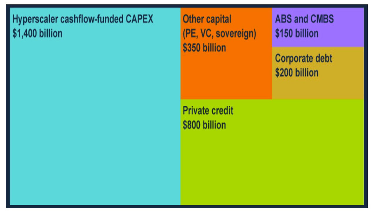 · AI/Tech investment wave remains. The latest earnings season shows momentum for the big tech companies and no major adverse earnings surprises. Though questions have been raised about the AI capex squeeze on long-term profits, the backlog of orders for Nvidia, Microsoft, Amazon and Alphabet means that investors are counting on revenue and double digit earnings to remain healthy in 2026 and 2027 for some of the Magnificent 7. Further out in 2028-30, continued strong cloud based and semiconductor revenue and profit projections are a key element behind expectations of strong AI Capex investment. Healthy cash flow means that most new investment for these companies is internally financed and any borrowing by some of the Magnificent 7 comes on underleveraged balance sheets. It is estimated that the hyperscaler should be able to fund close to 50% of overall AI Capex from cash flow (Figure 2) – ancillary investment in power generation is separate. So far, these cloud and chip companies have been the clear winners, and will likely be supported by U.S. financial markets through any moderate storms.