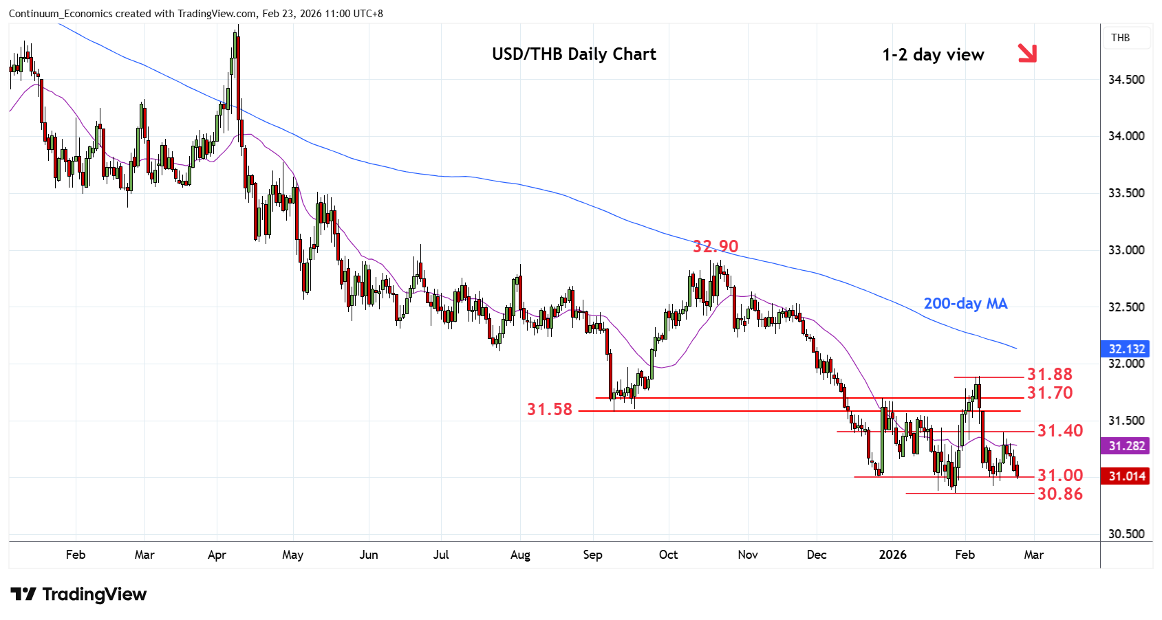03:00 GMT - Settled back to retest the 31.00 level following rejection from test of the 31.40 resistance. Risk is seen for break to expose the 28 January current year low at 30.86 to retest. Below this will further extend the broader losses from the October 2022 high and see room to support at the 30.80 congestion. Lower still, will see room to support at the 30.65/30.50 area. Meanwhile, resistance at the 31.20/31.40 congestion are now expected to cap and sustain losses from the 31.88, 6 February swing high.